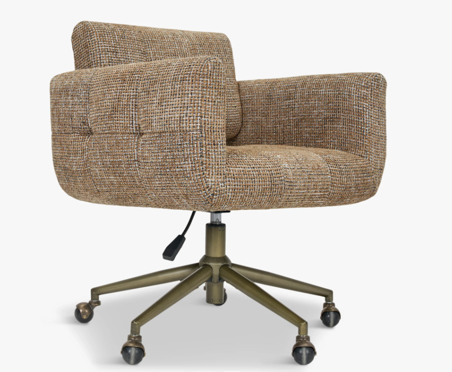 Chaise de bureau pivotante au design rétro-contemporain, dotée d'un revêtement en tissu tissé texturé beige-brun et d'une base étoilée en métal finition bronze. Confort optimal et style scandinave pour un espace de travail élégant.