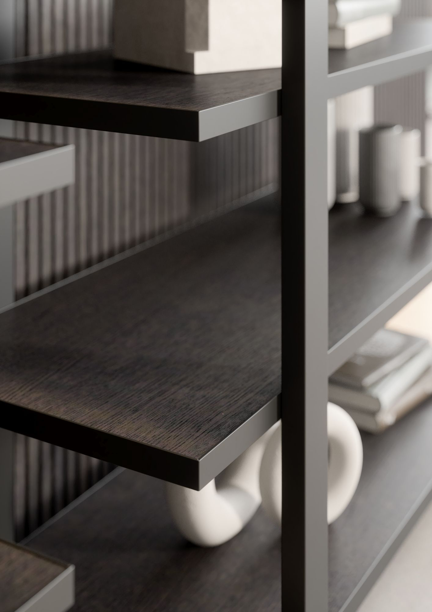 Une bibliothèque aérienne au design graphique noir mat, parfaite pour structurer votre espace tout en exposant vos livres et objets d'art.